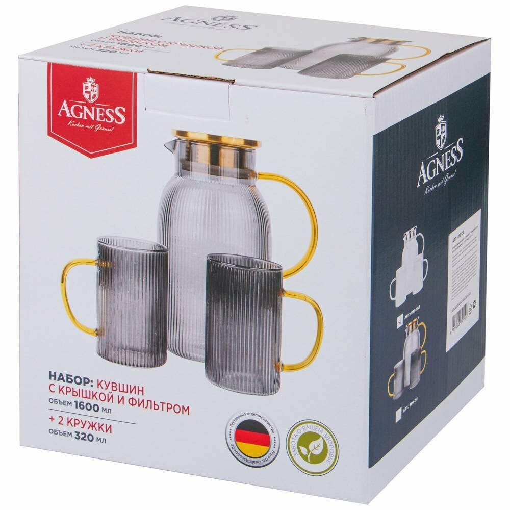 Набор: стеклянный кувшин с крышкой фильтром 1600 мл + 2 кружки 320 мл Agness "Smoky" информация: