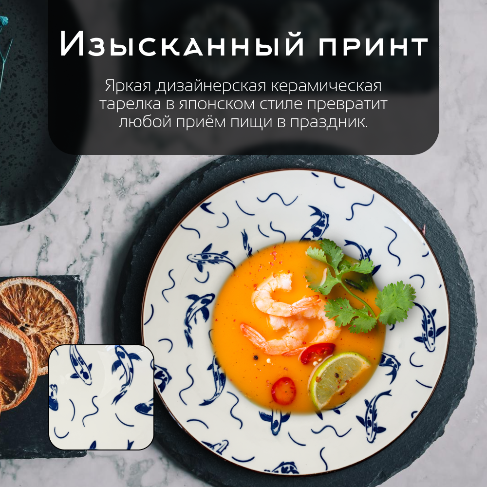 Тарелка керамическая Homium, Japanese Collection в японском стиле Рыбки голубой, D20см, набор 2шт