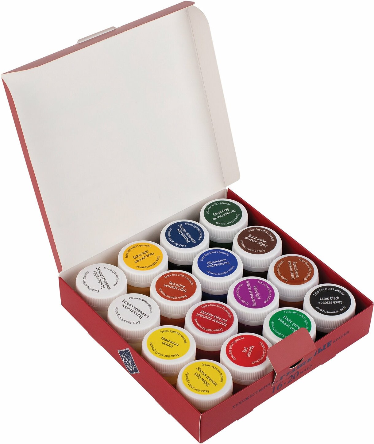 | Комплектация | цвета: белила цинковые или белила титановые (2 баночки), лимонная, желтая светлая, охра светлая или охра золотистая, охра красная или английская красная, краплак красный или кармин, красная или киноварь, бирюзовая или лазурь железная, ультрамарин, фиолетовая светлая или фиолетовая темная, ярко-зеленая или изумрудная светлая, зеленая темная, сиена жженая, умбра жженая, сажа газовая |