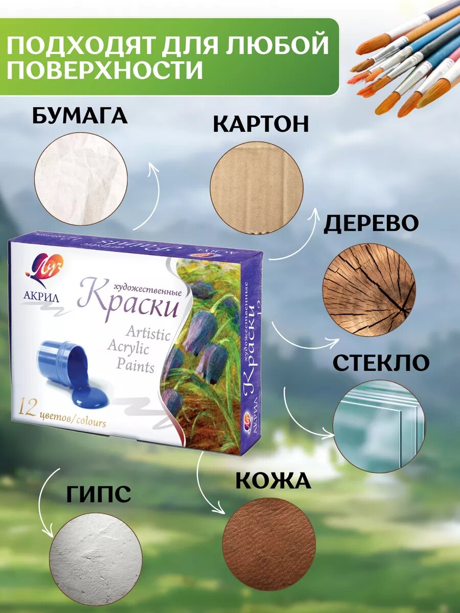 Набор акриловых красок "Луч", глянцевые, для творчества, 12 цветов по 20мл информация: