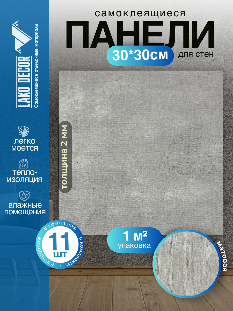 Мини Комплект 11шт Самоклеящаяся ПВХ плитка LAKO DECOR "Серый камень", толщина 2мм, 1м² 1 999 ₽