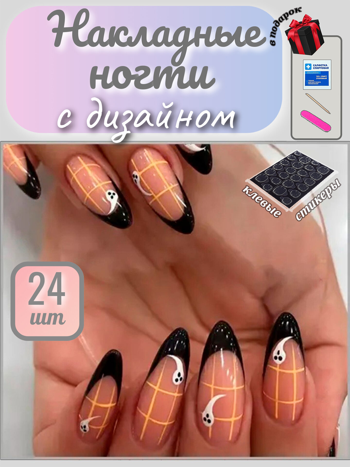 Комплект накладных ногтей NAILS с дизайном + клеевые стикеры 24шт информация: