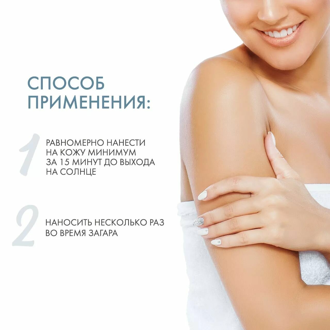 | Способ применения | равномерно нанесите на кожу лица и тела как минимум за 15 минут до выхода на солнце. Применение следует повторять несколько раз в течение дня, также после контакта с водой |