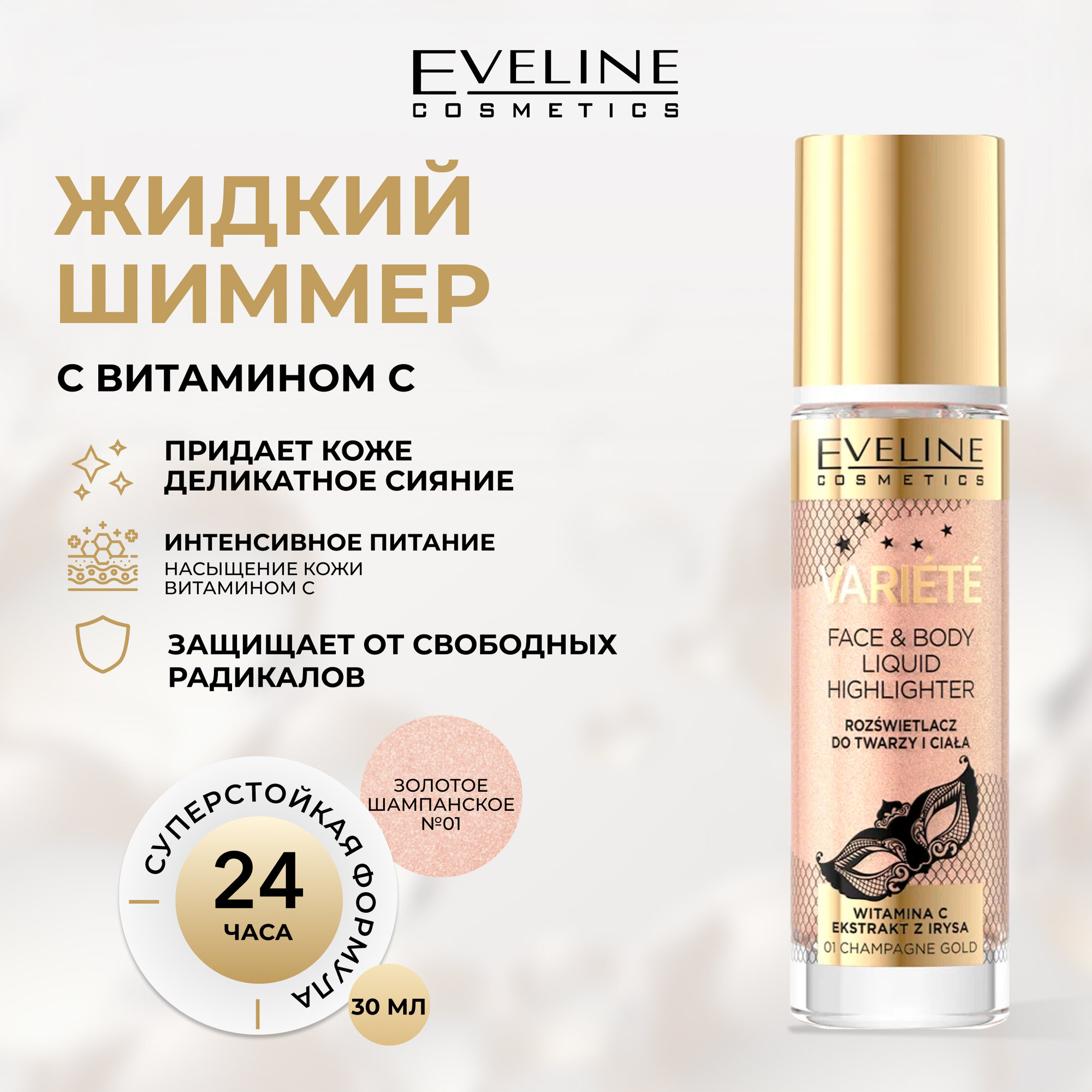 10 цен на Шиммер для лица и тела EVELINE VARIETE жидкий с экстрактом ириса тон № 01 champagne gold, 30мл