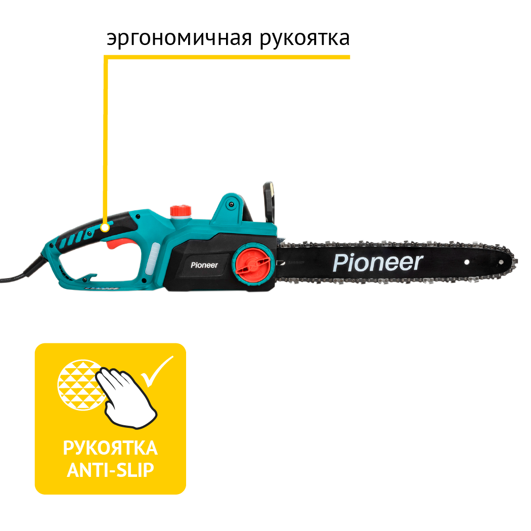 Пила цепная сетевая Pioneer, длина шины 40 см, шаг цепи 3/8 дюйм, 57 звен, ECS-2200-16HS, 220-230 В, 64 см, 19736 информация: