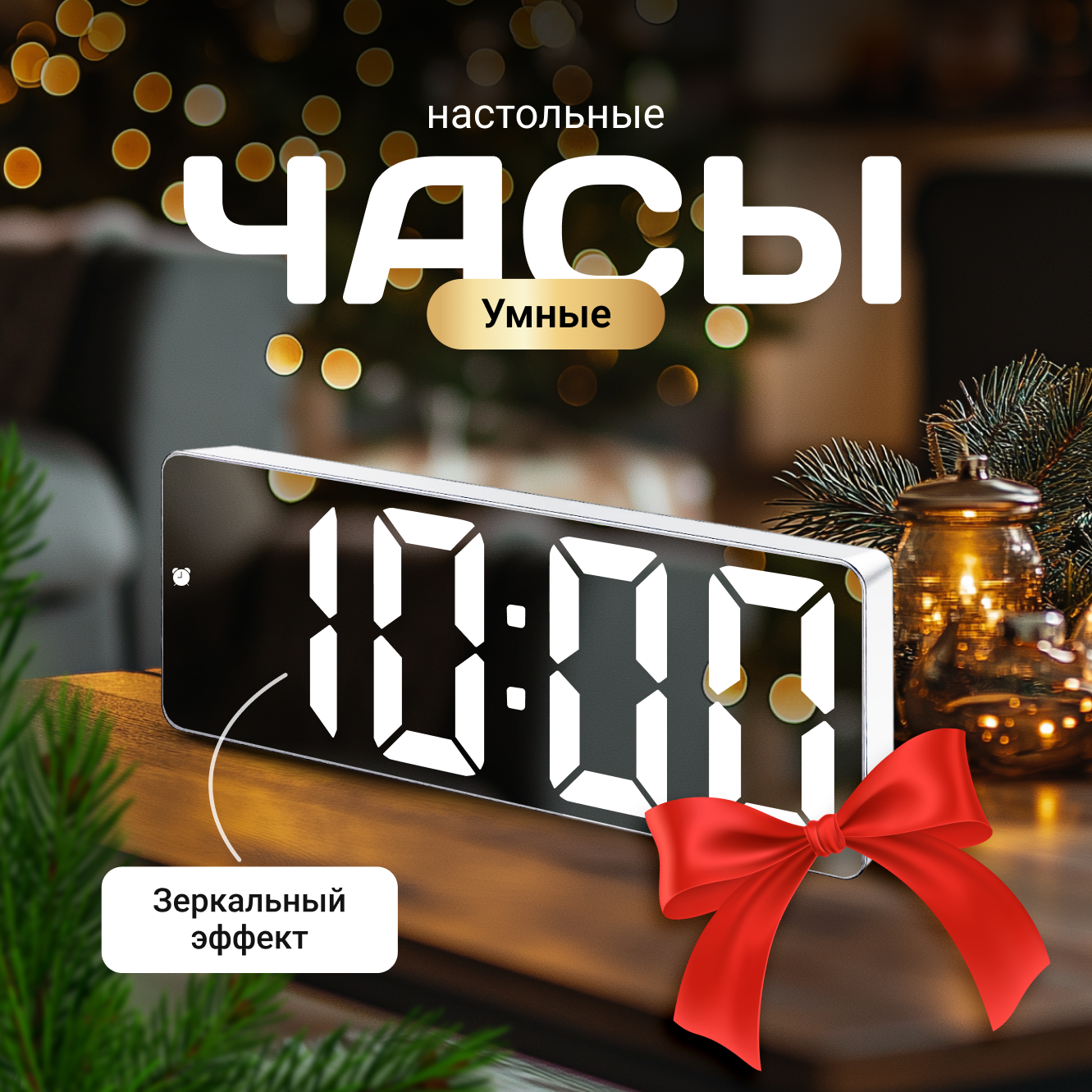 Часы настольные электронные на батарейках от сети, зеркальная поверхность, с белыми цифрами, декор для кухни и дома 739 ₽