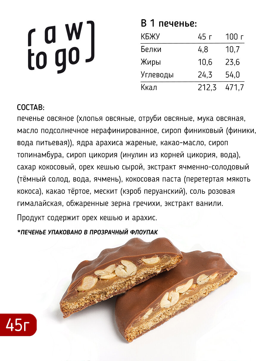 | Состав | печенье овсяное (хлопья овсяные, отруби овсяные, мука овсяная, масло подсолнечное нерафинированное, сироп финиковый (финики, вода питьевая)), какао-масло, сироп топинамбура, сироп цикория (инулин из корней цикория, вода), сахар кокосовый, орех кешью сырой, экстракт ячменно-солодовый (тёмный солод, вода, ячмень), кокосовая паста (перетертая мякоть кокоса), какао тёртое, мескит (кэроб перуанский), соль розовая гималайская, обжаренные зерна гречихи, экстракт ванили. Продукт содержит орех кешью и производится на предприятии, где используется арахис. |