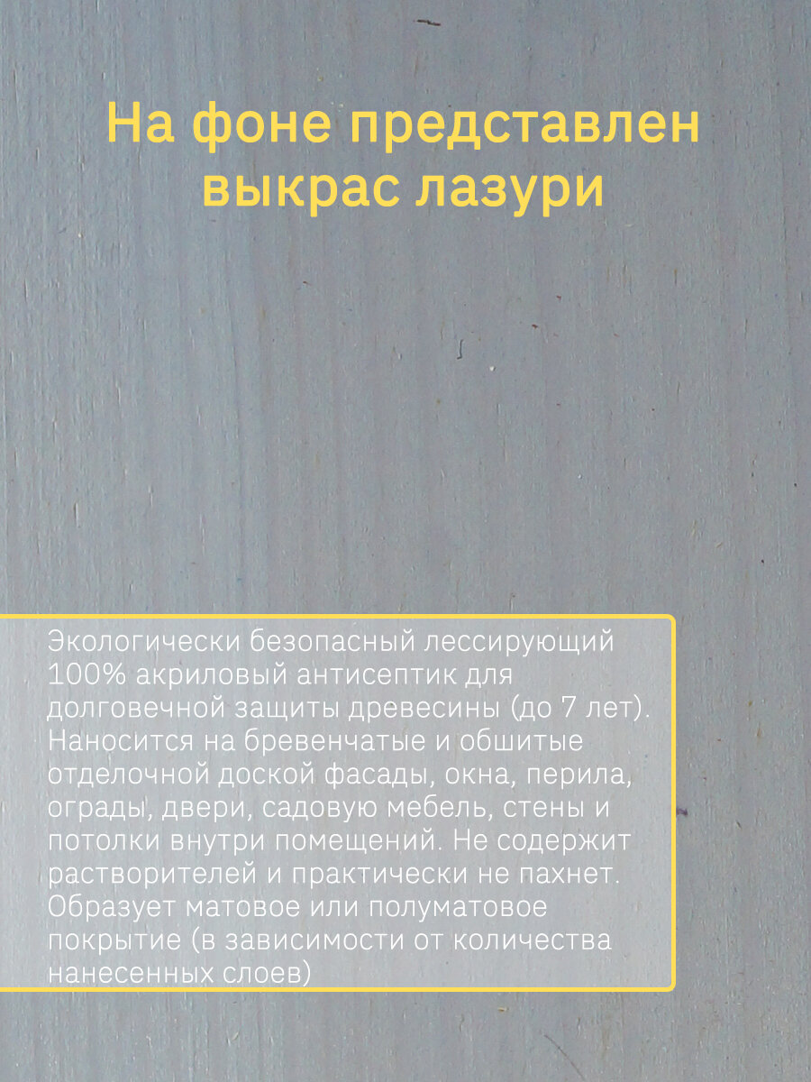 | Дополнительная информация | сделана на 100% акриловом связующем; наносится на поверхность строганой и пиленой древесины; сохраняет видимой текстуру и подчеркивает рисунок натуральной древесины; образует матовое или полуматовое покрытие (в зависимости от количества нанесенных слоев); обеспечивает защиту древесины до 7 лет. |