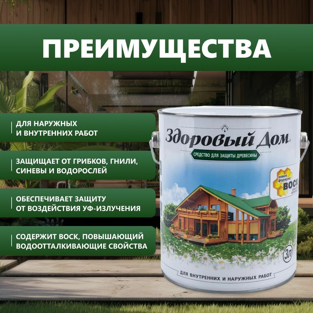 Средство для Защиты Древесины Здоровый Дом 3л Бесцветный, Алкидная для Внутренних и Наружных Работ.