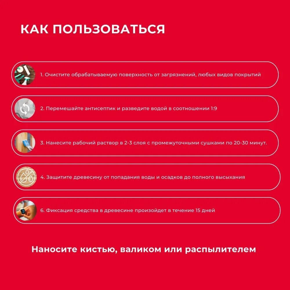 | Дополнительная информация | концентрат 1:9; расход: 150-250 г/м² — для строганной древесины, 250-400 г/м² — для пиленой древесины; хранить при температуре от +5°С до +40°С, 5 циклов замораживания-размораживания |