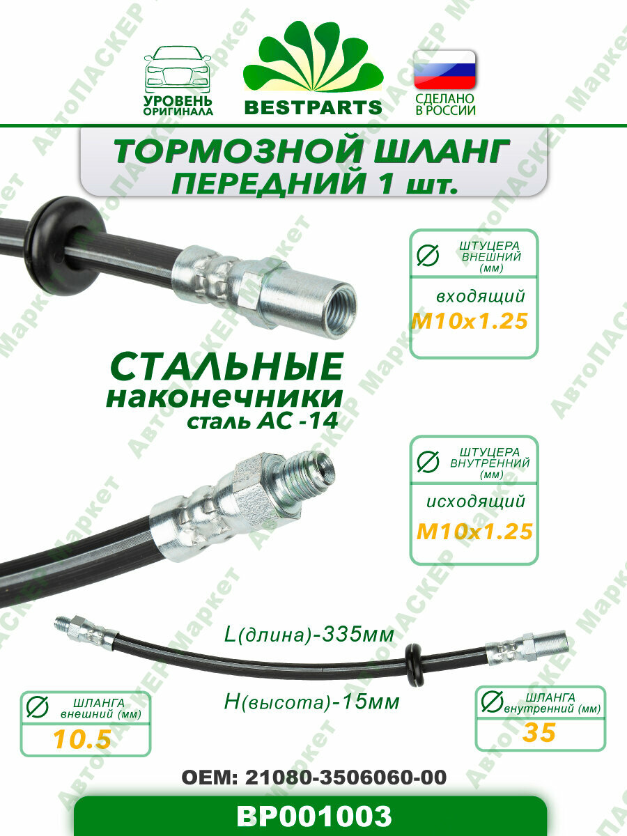 Шланг тормозной передний, 335 мм, для а/м ВАЗ Лада 1111 Ока, 2108/09/099, 2113/14/15, 1 шт, гибкий, BP001003, 42821 информация: