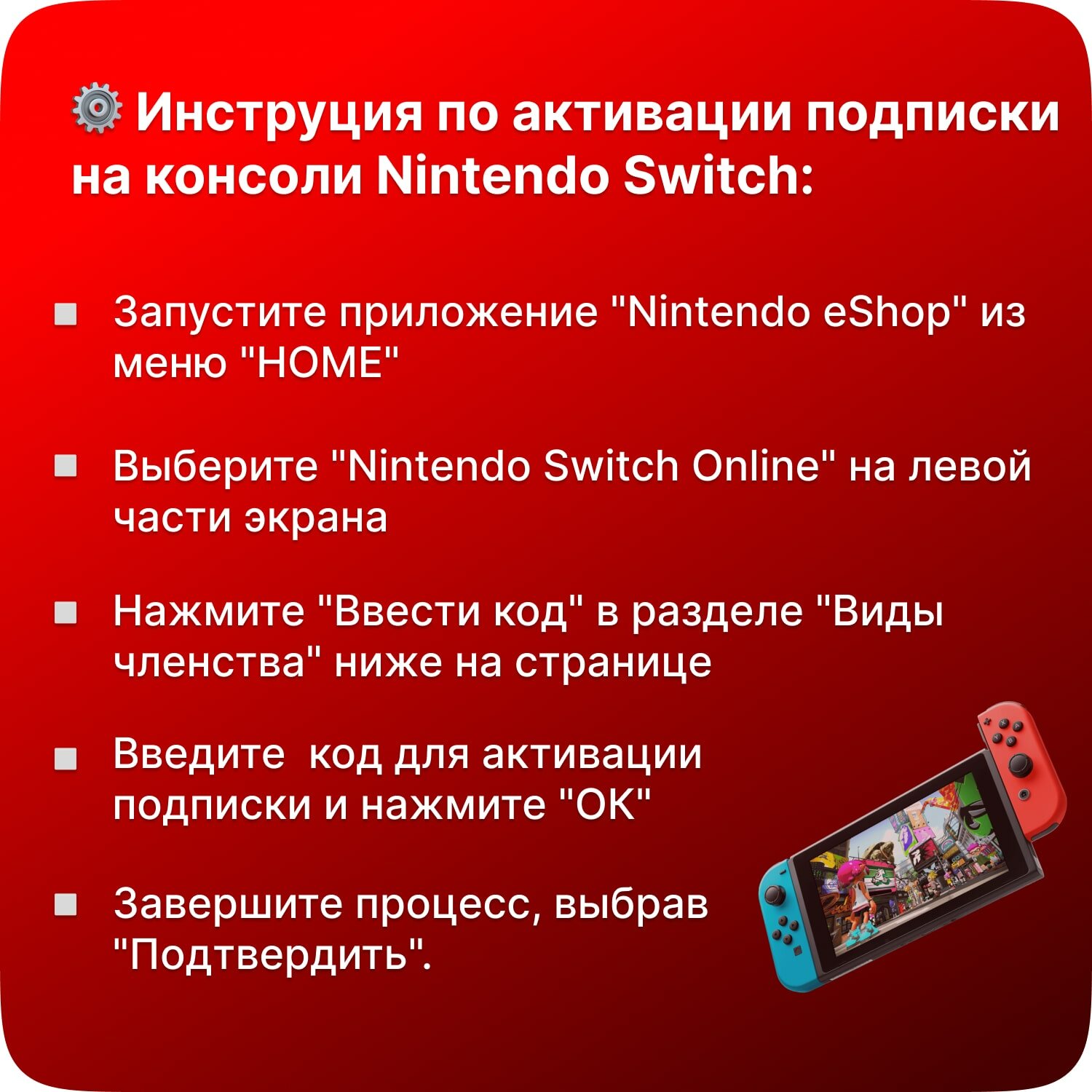 | Инструкция по активации | Если вы получили код вида PC12345678, обратитесь сначала к нам в чат поддержки и назовите его. На сайте Nintendo eShop: 1. Войдите в свой аккаунт Nintendo через браузер и перейдите на страницу "Redeem code". 2. Введите 16-значный код для пополнения счета и нажмите "ОК". 3. Завершите процесс, нажав "Accept". На консоли Nintendo Switch: 1. Запустите приложение "Nintendo eShop" из меню "HOME". 2. Выберите "Nintendo Switch Online" на левой части экрана. 3. Нажмите "Ввести код" в разделе "Виды членства" ниже на странице. 4. Введите 16-значный код для активации членства Nintendo Switch Online и нажмите "ОК". 5. Завершите процесс, выбрав "Подтвердить". |