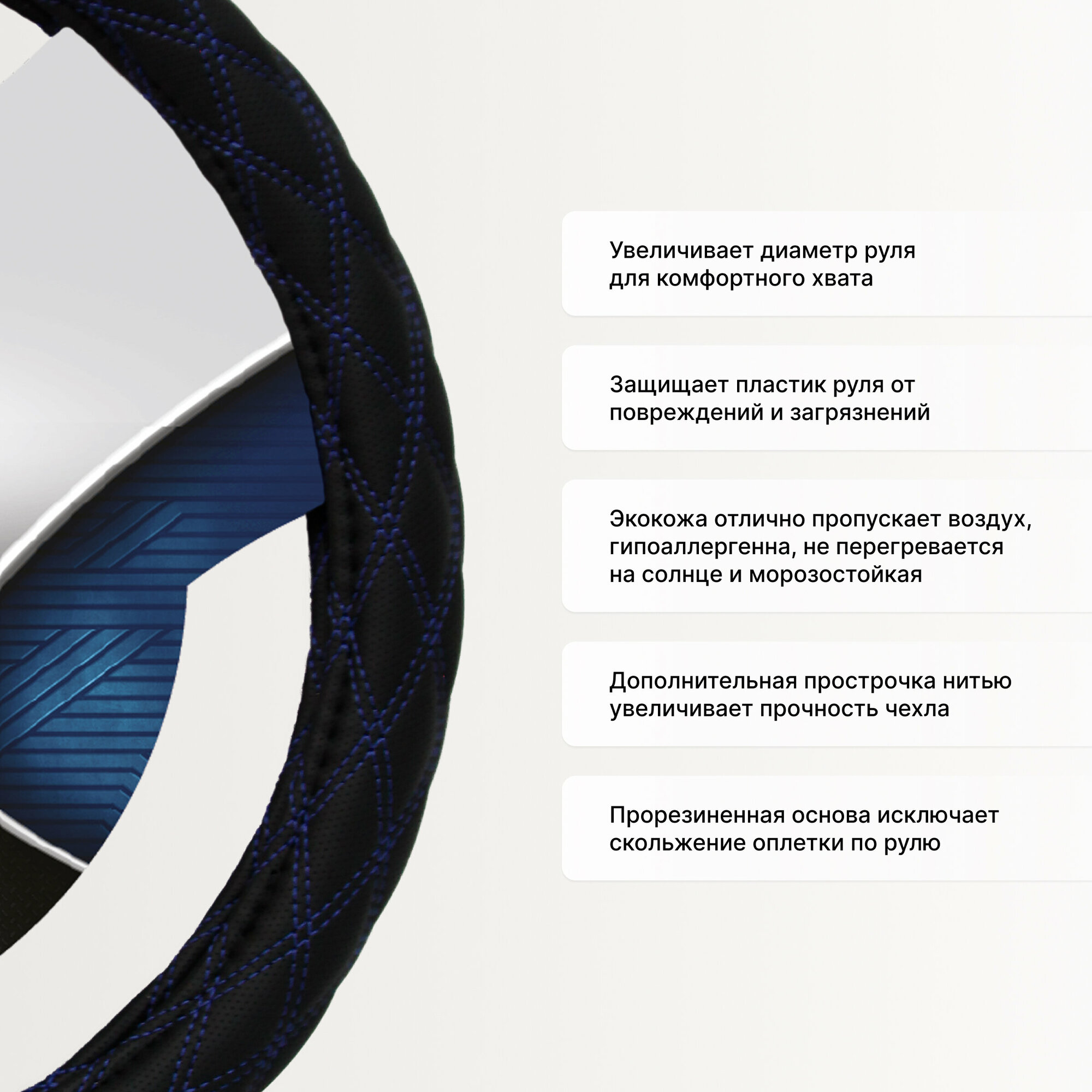 | Дополнительная информация | Основа оплетки на руль прорезинена, что исключает ее скольжение по рулю. Материал для изготовления основы — белая резина, которая имеет ряд преимуществ перед уже привычной черной, она более эластичная, прочная и не имеет запаха |