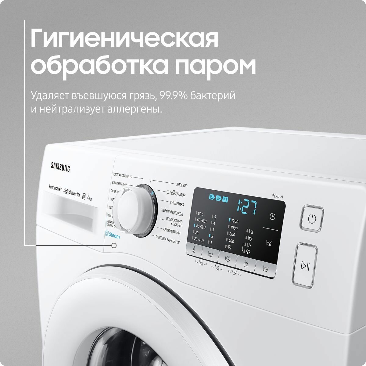 Узкая стиральная машина Samsung WW80AGAS21TELP, 8 кг, с электронным управлением, инверторным мотором, технологией Eco Bubble, белая информация: