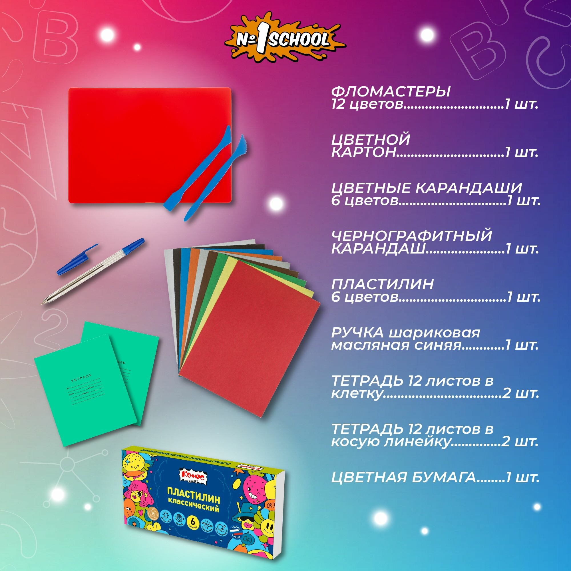 | В комплекте | тетрадь школьная А5 12 листов в клетку - 2 шт., тетрадь школьная А5 12 листов в косую линейку - 2 шт., обложка для дневника и тетрадей 35×21 см - 5 шт., ручка шариковая масляная синяя, кисти круглые пони № 3 и № 5, пластилин 6 цветов, бумага цветная А4, карандаши цветные 6 цветов, краски акварельные, коврик для лепки разноцветный 33×23 см, фломастеры 6 цветов, линейка деревянная 15 см, точилка для карандашей, карандаш чернографитный HB заточенный, картон цветной А4 8 листов, ластик, пенал односекционный пластиковый, ножницы, альбом для рисования А4 8 листов, клей-карандаш 10 г, блокнот (формат листов А6 или А7 в зависимости от партии) |