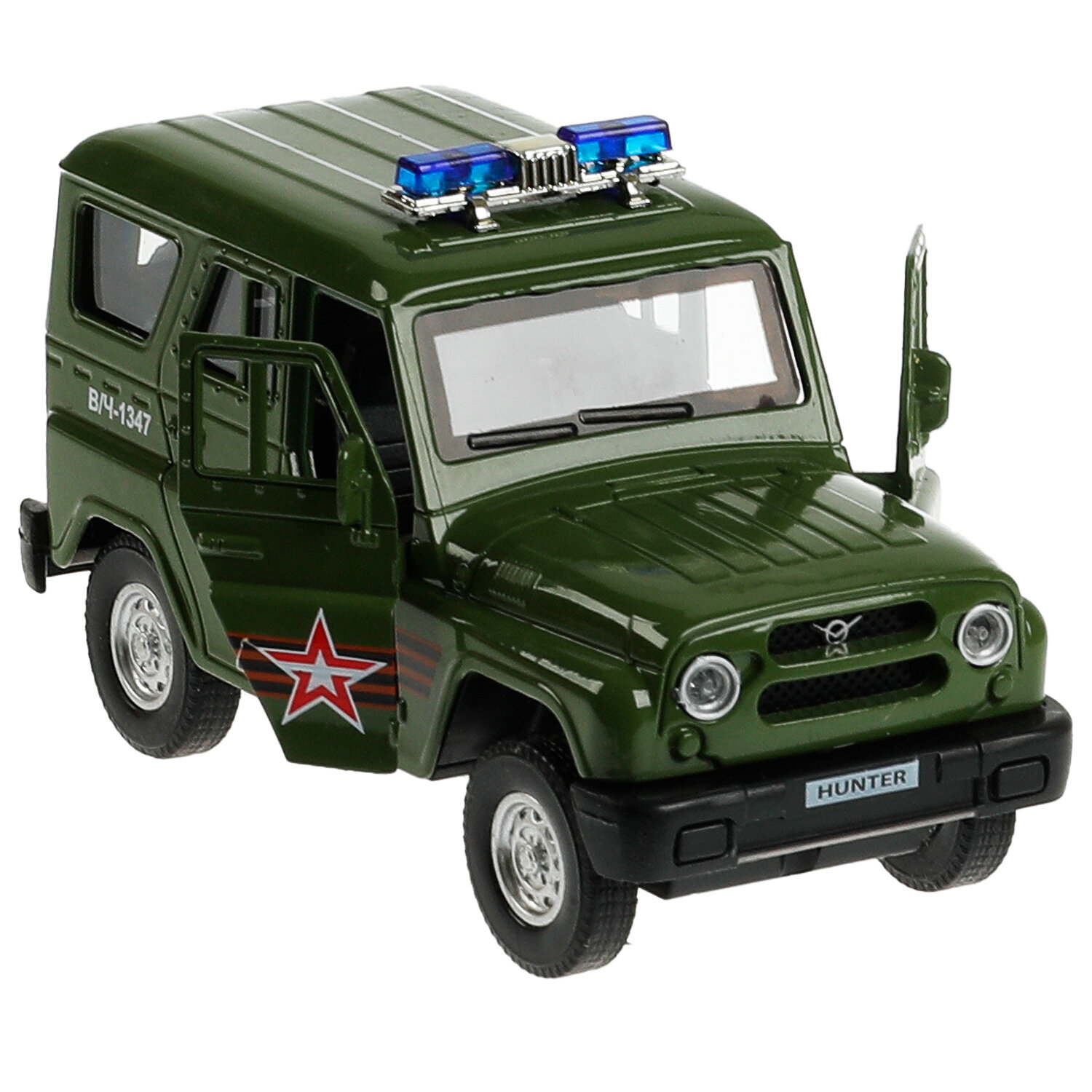 Машинка детская УАЗ Хантер Военный 12 см, Технопарк, зеленая, открываются двери и багажник, металлическая, свет и звук информация: