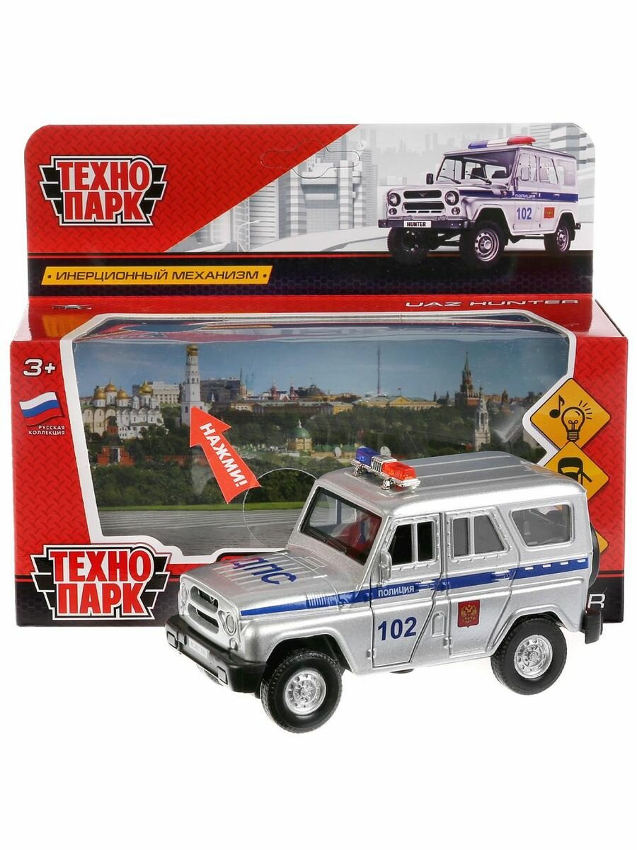 10 цен на Машинка детская УАЗ Хантер Полиция 12 см, Технопарк, серебристая, открываются двери и багажник, металлическая, свет и звук