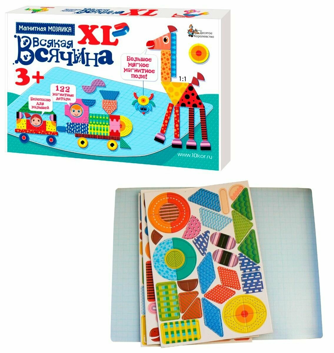 | Дополнительная информация | состав магнитной мозаики «Всякая всячина» XL: двухстороннее размеченное поле размером 29 на 22 сантиметра из винила и мягкого железа; 122 элемента различной формы и расцветки из магнитного винила |