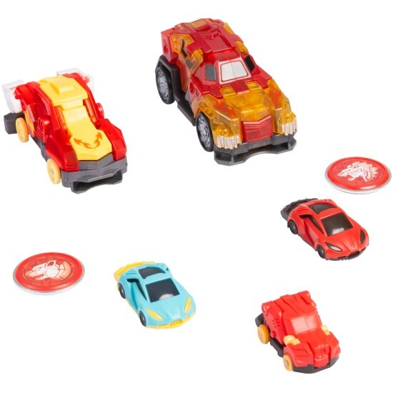 | Комплектация | В набор входят 2 машинки-трансформеры (24х13х9 см) и (11х8х14 см), 2 энергетических диска, 2 скричер-кара, минискричер. |