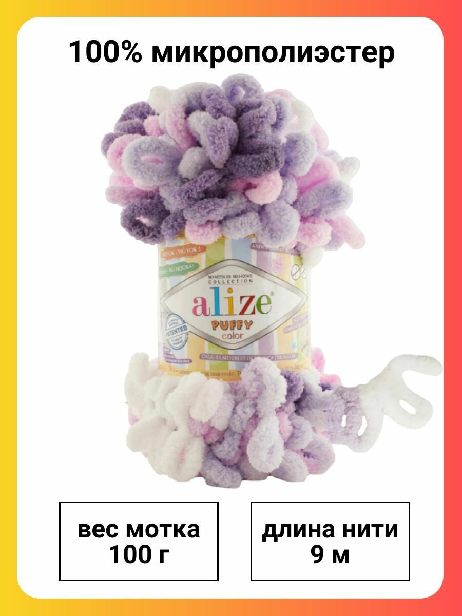 Пряжа Alize Puffy color бело-розово-сиреневый (6051), 100%микрополиэстер, 9м, 100г, 2шт