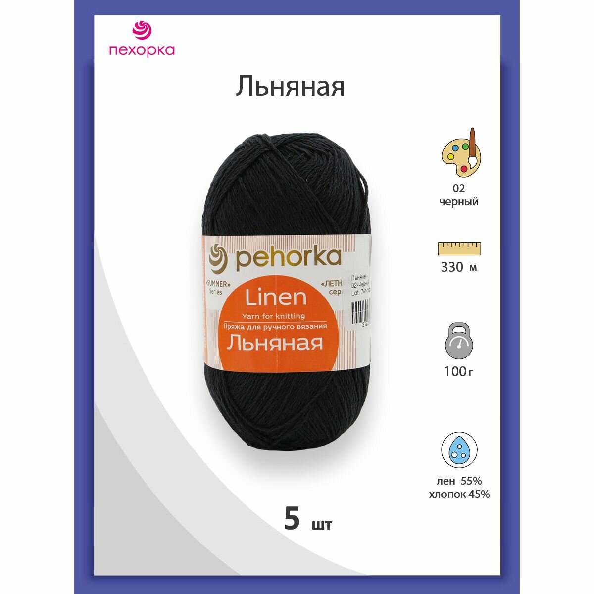 Пряжа для вязания Пехорка 'Льняная' 100г, 330м (лен 55%, 45% хлопок) (02 черный), 5 мотков информация: