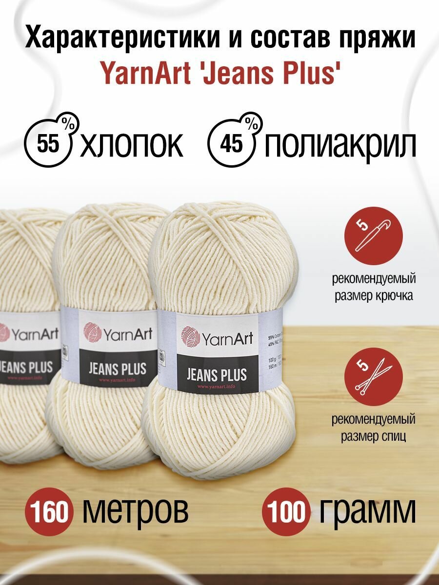 Пряжа для вязания YarnArt 'Jeans Plus' 100г, 160м (55% хлопок, 45% полиакрил) (03 молочный), 5 мотков информация: