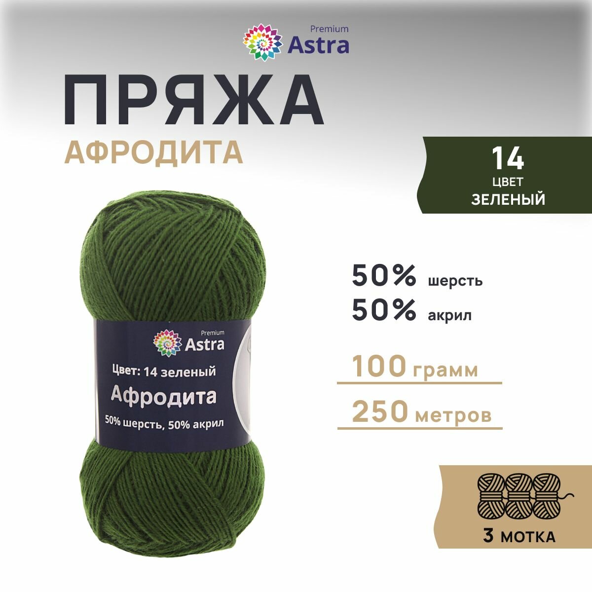 Пряжа для вязания Astra Premium 'Афродита' 100г, 250м (50% шерсть, 50% акрил) (14 зеленый), 3 мотка информация: