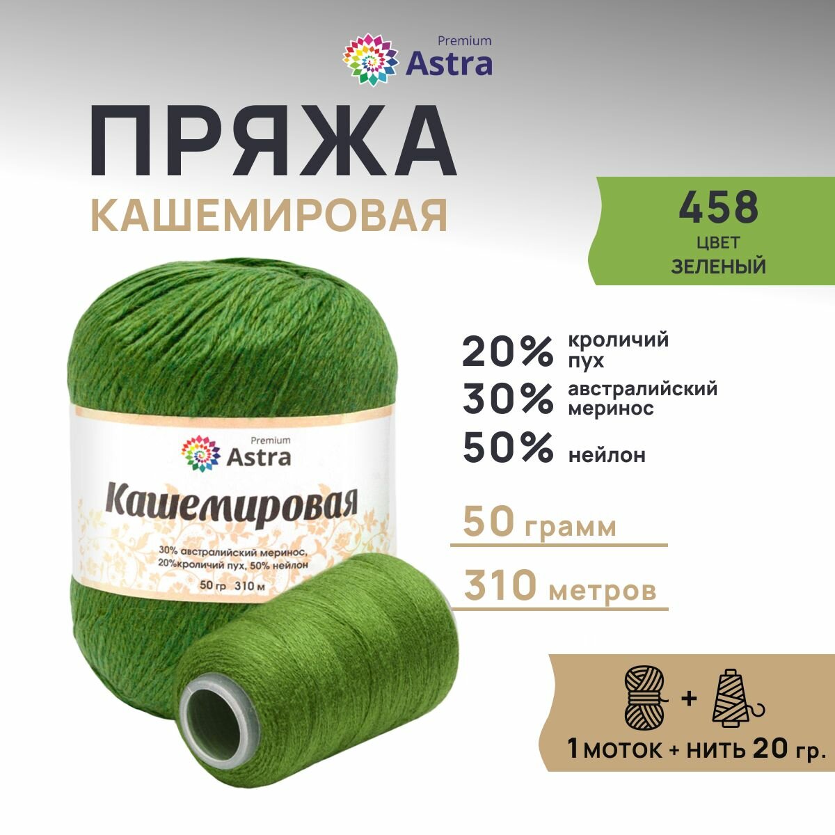Пряжа для вязания Astra Premium 'Кашемировая' (Cashmere), 50г, 310м (20% кроличий пух, 30% австралийский меринос, 50% нейлон) + нить 20г (458 зеленый)