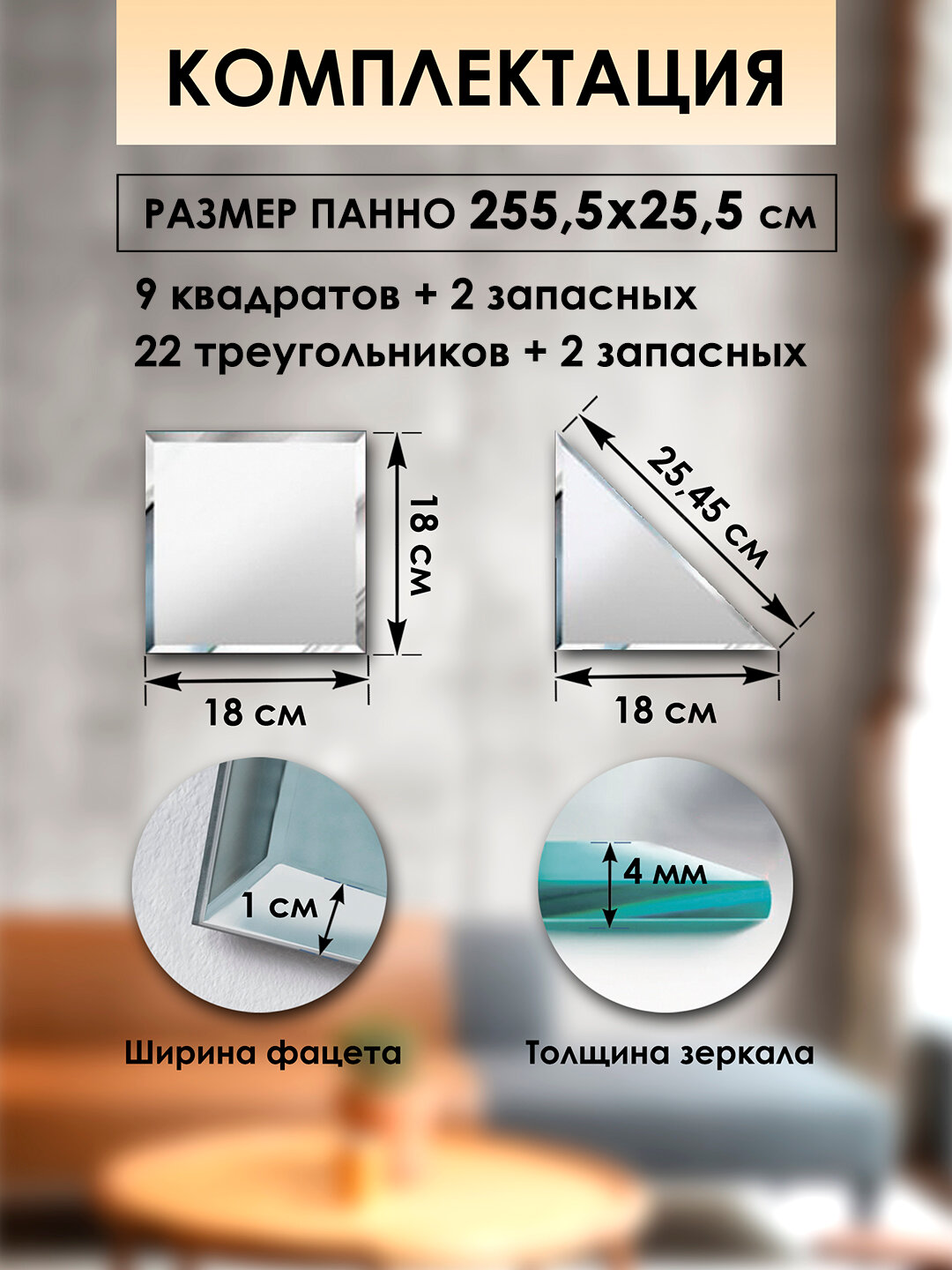 | Комплектация | плика зеркальная квадратная, плитка зеркальная треугольная |