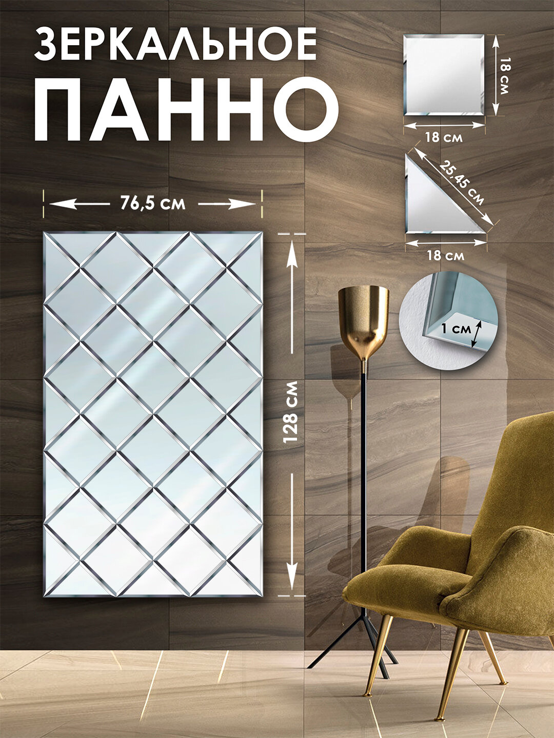 10 цен на Зеркальное панно "Стеклография" с фацетом, на стену 128 см. х 76,5 см. зеркальная плитка из квадратов и треугольников.