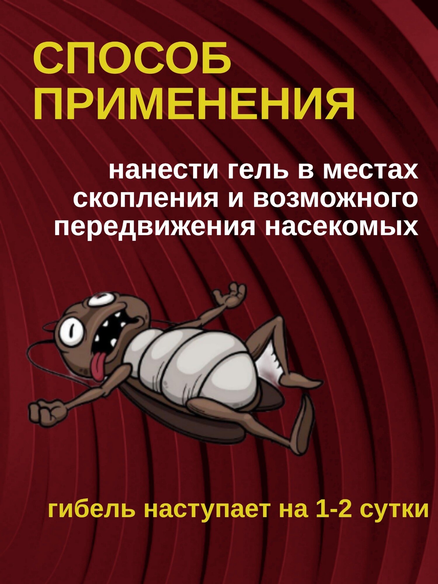 | Способ применения | для уничтожения тараканов перед обработкой проведите уборку помещения, плотно закройте водопроводные краны и ёмкости с водой, лишив насекомых источников влаги; наносите гель пунктирной линией вдоль плинтусов, в щели и отверстия, в которых могут укрываться тараканы; при малой и средней численности тараканов расход средства: 2 см геля на 4-6 см обрабатываемой поверхности; при большой численности 2 см геля на 2 см поверхности; гель можно нанести полосками или каплями на небольшие листочки бумаги и разложить их в местах обитания насекомых; полная гибель тараканов наступает на вторые сутки; для уничтожения муравьёв нанесите гель пунктиром в местах обнаружения или передвижения насекомых с интервалом в 2-4 см между полосками; полная гибель наступает на 2‒3 сутки; повторную обработку следует проводить не ранее, чем через 4 недели; остаточное действие сохраняется 1,5‒2 месяца |