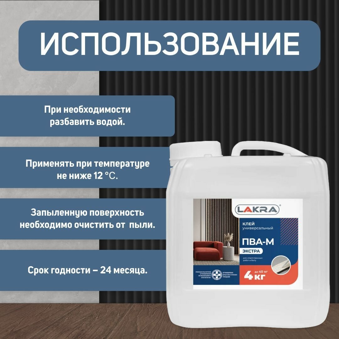 Клей Лакра ПВА-М Экстра универсальный строительный 4кг информация: