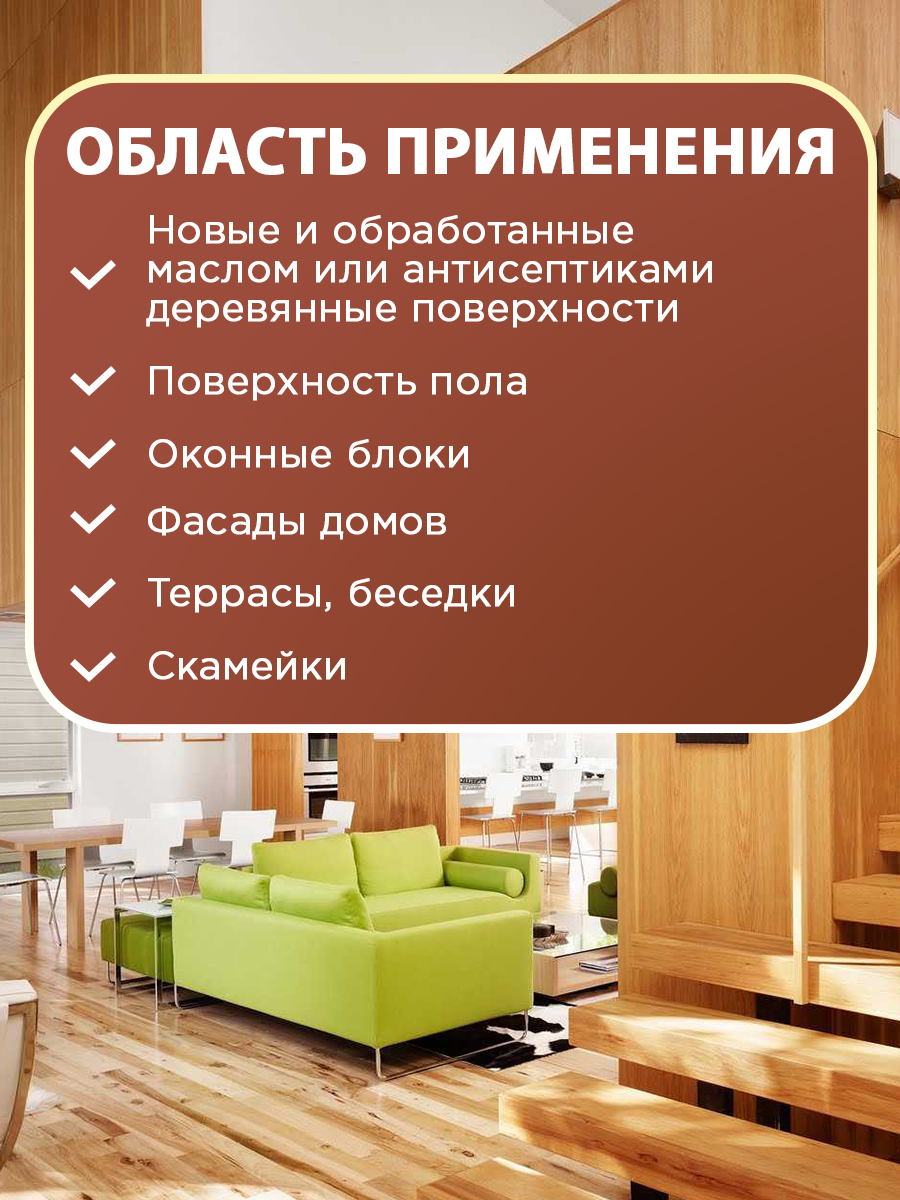 | Область применения | для дверей / для заборов / для использования в сауне/бане / для карнизов и наличников / для крыши / для мебели / для окон / для паркета / для пола / для потолков / для садовой мебели / для стен / для ступеней / для торцов срубов / для фасадов |