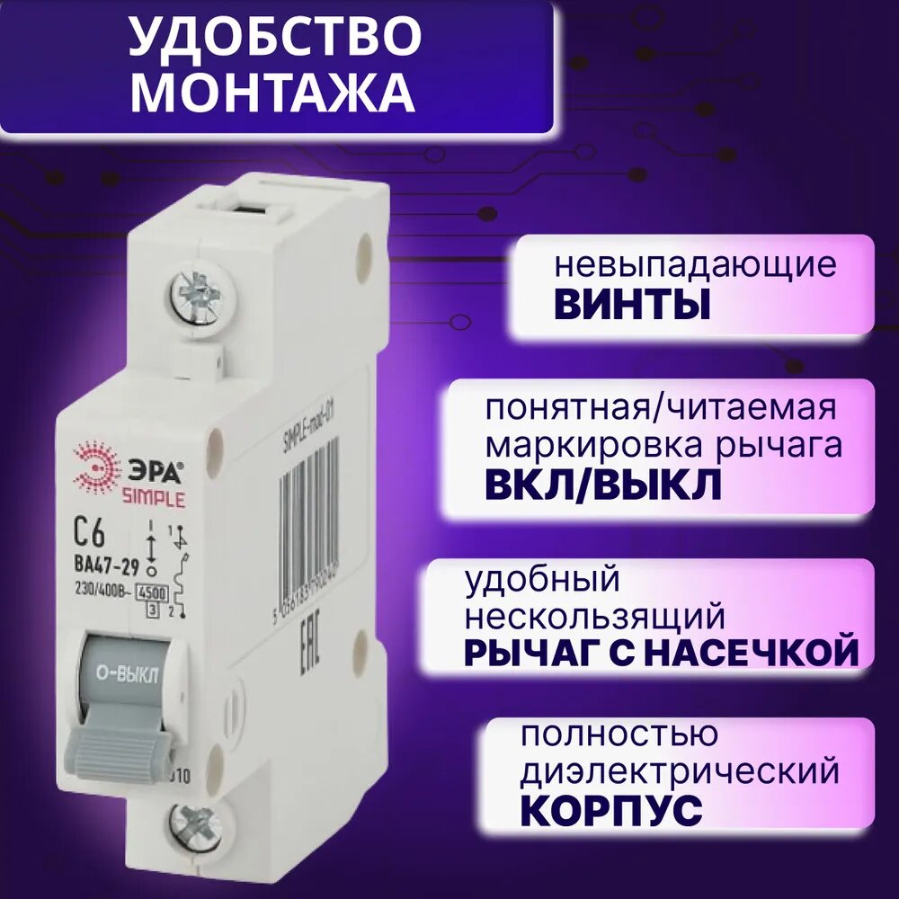 Отзывы на Выключатель автоматический модульный 1п C 6А 4.5кА ВА 47-29 SIMPLE-mod-01, ЭРА Б0039218 (1 шт.)