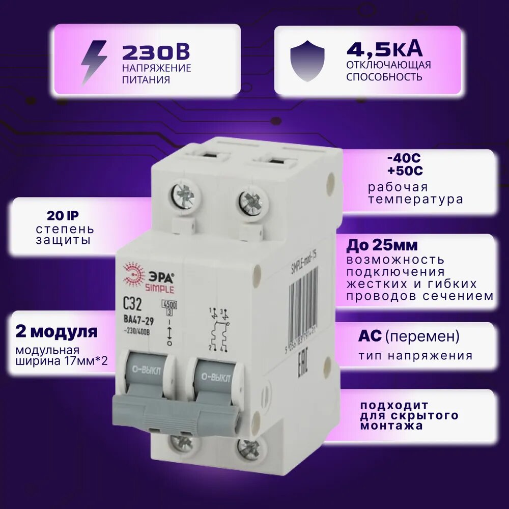 Автоматический выключатель 2P (2П) 32А (C) 4,5кА ВА 47-29 SIMPLE-mod-15 Б0039232 ЭРА 1шт информация: