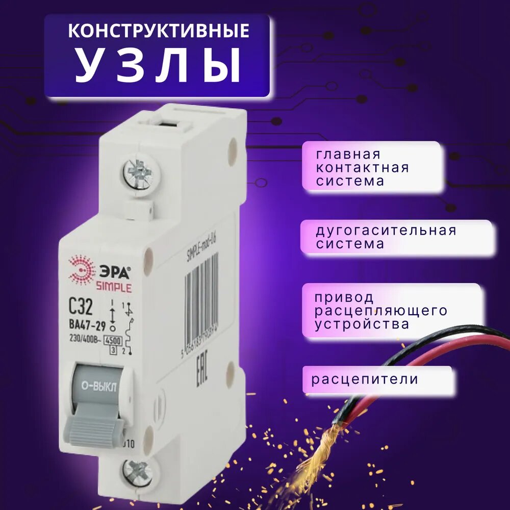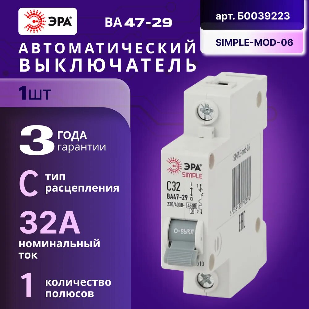 Отзывы на Автоматический выключатель 1P (1П) 32А (C) 4,5кА ВА 47-29 SIMPLE-mod-06 ЭРА Б0039223 1шт
