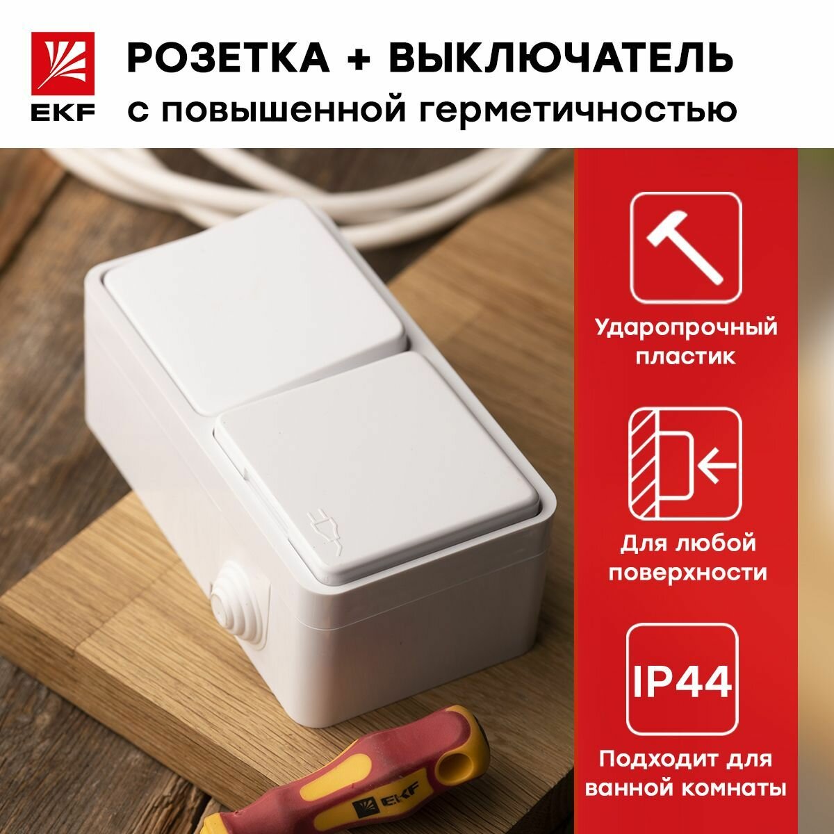 Блок EKF / ЕКФ PROxima Прага розетка и выключатель с крышкой, горизонтальный, белый, 16А 230В IP44, EKRV16-050-10-440 / электрика 606 ₽