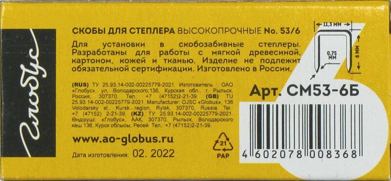 Скобы для степлера тип 53, 6мм, 1000шт (СМ53-6Б) информация: