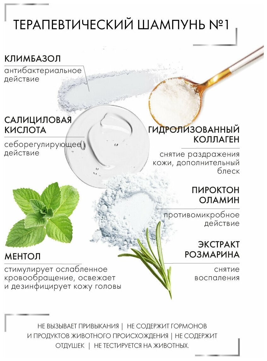 | Дополнительная информация | в острой ситуации рекомендуется интенсивный курс лечения продолжительностью 2-4 недели с ежедневным использованием шампуня №1; по окончании лечебного курса количество использований можно уменьшить; после процедуры можно перейти на Mild Climbazole Shampoo 3, который поможет сохранить достигнутый результат |