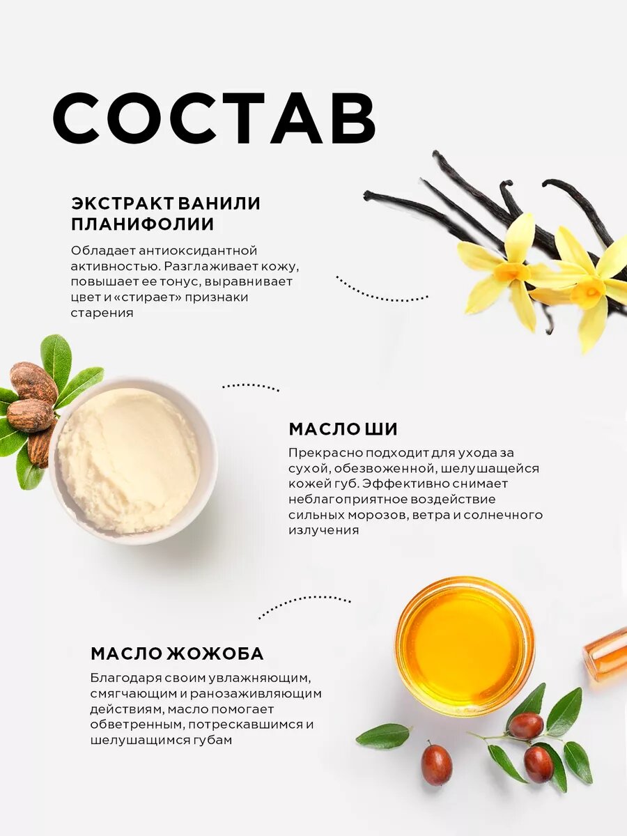 | Способ применения | В течение дня можно использовать в качестве увлажняющего бальзама, нанося на губы тонким слоем. А вечером, перед сном, в качестве маски, нанести необходимое количество на очищенные губы на всю ночь. |
