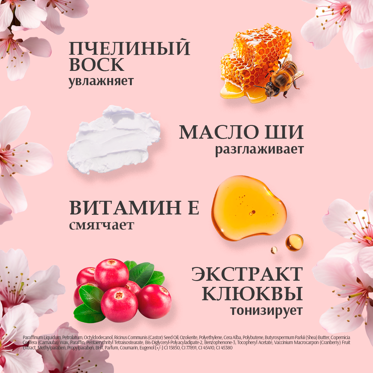 | Состав | Paraffinum Liquidum, Petrolatum, Octyldodecanol, Ricinus Communis (Castor) Seed Oil, Ozokerite, Polyethylene, Cera Alba, Polybutene, Butyrospermum Parkii (Shea) Butter, Copernicia Cerifera (Carnauba) Wax, Paraffin, Pentaerythrityl Tetraisostearate, Bis-Diglyceryl-Polyacyladipate-2, Benzophenone-3, Tocopheryl Acetate, Vaccinium Macrocarpon (Cranberry) Fruit Extract, Methylparaben, Propylparaben, BHT, Parfum, Coumarin, Eugenol [+/-] CI 15850, CI 17200, CI 16035, CI 45410, CI 77492, CI77891, CI 45380. |