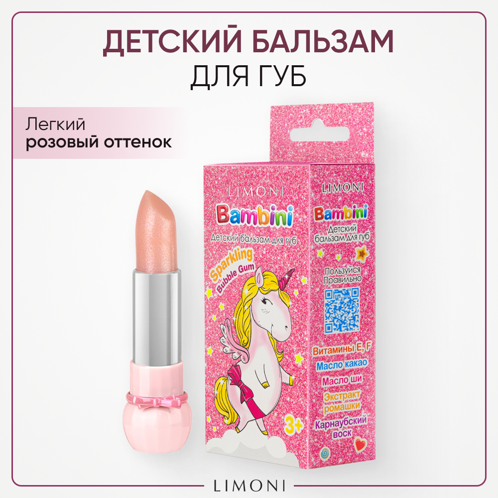 Отзывы на LIMONI Бальзам для губ детский увлажняющий с блесткми и витамином Е Bambini Sparkling Bubble Gum Тон 01