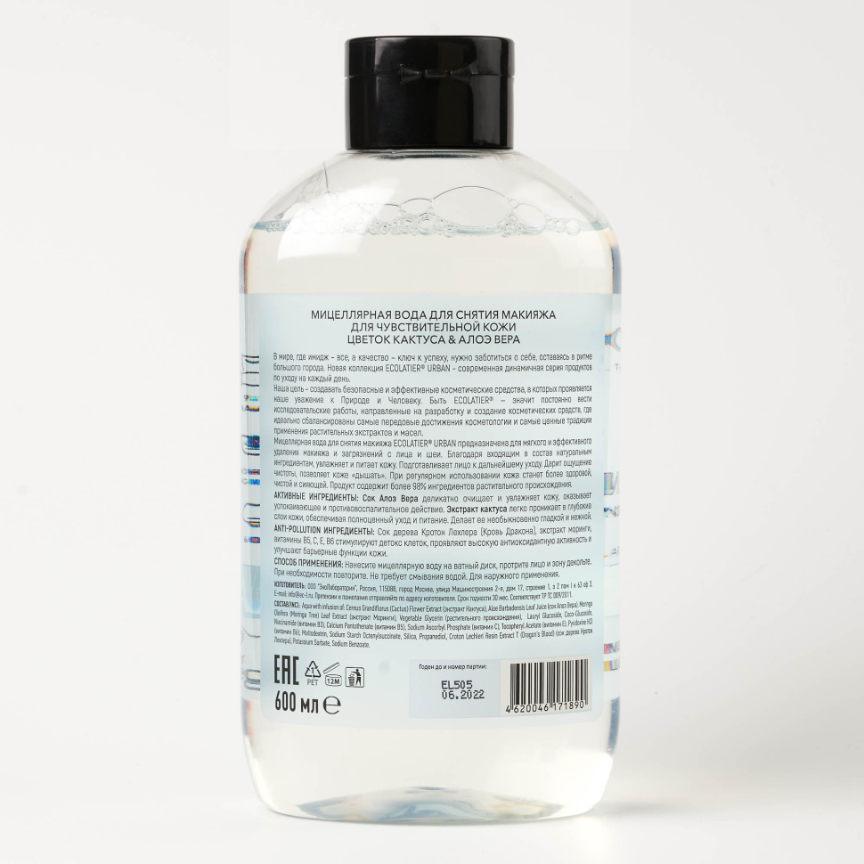 ECOLATIER Мицеллярная вода для снятия макияжа с цветком кактуса и алоэ вера, 600 мл информация: