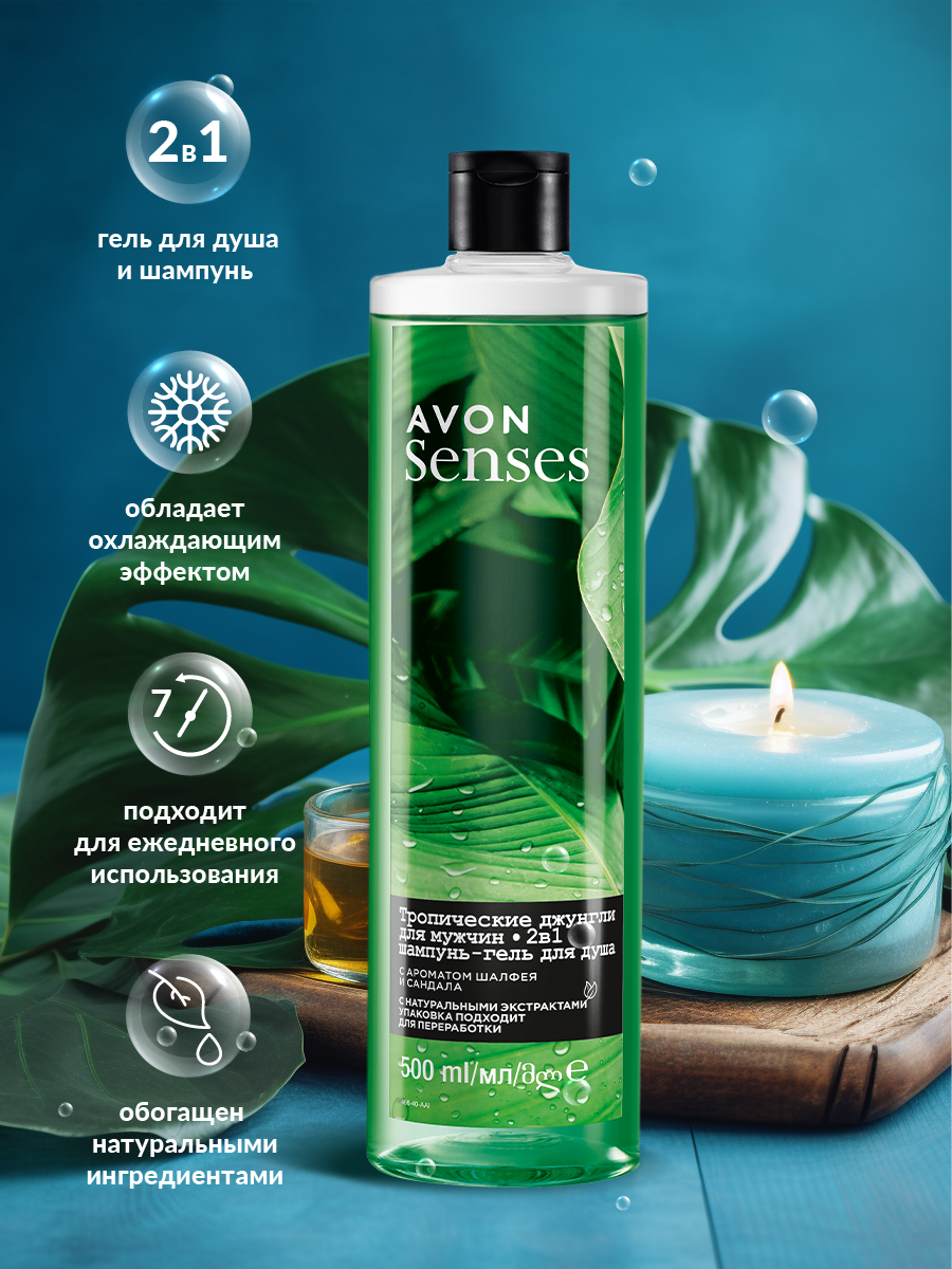 AVON Senses Шампунь-гель для душа для мужчин Тропические джунгли (Сила притяжения), 500 мл