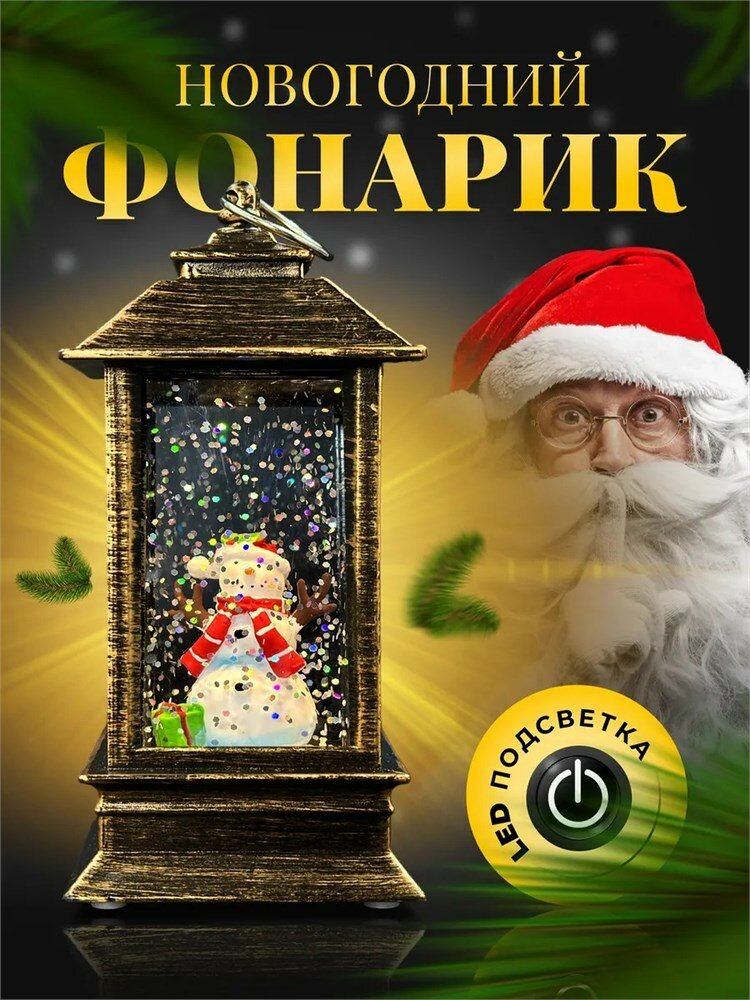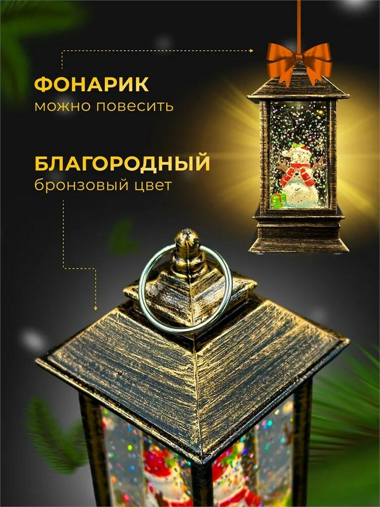 Новогодний декоративный фонарик с подсветкой и снегом | LED-Светильник в ретро-стиле "Снеговичок", 13 см 13х5,5х5,5 см Под бронзу информация:
