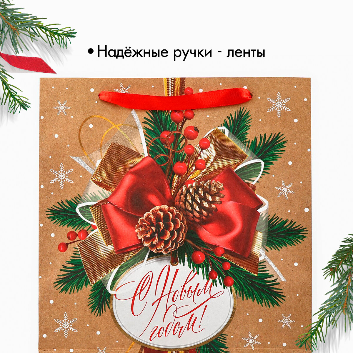 Пакет крафтовый квадратный С Новым годом , 14 x 14 x 9 см