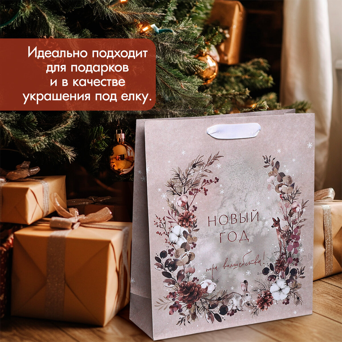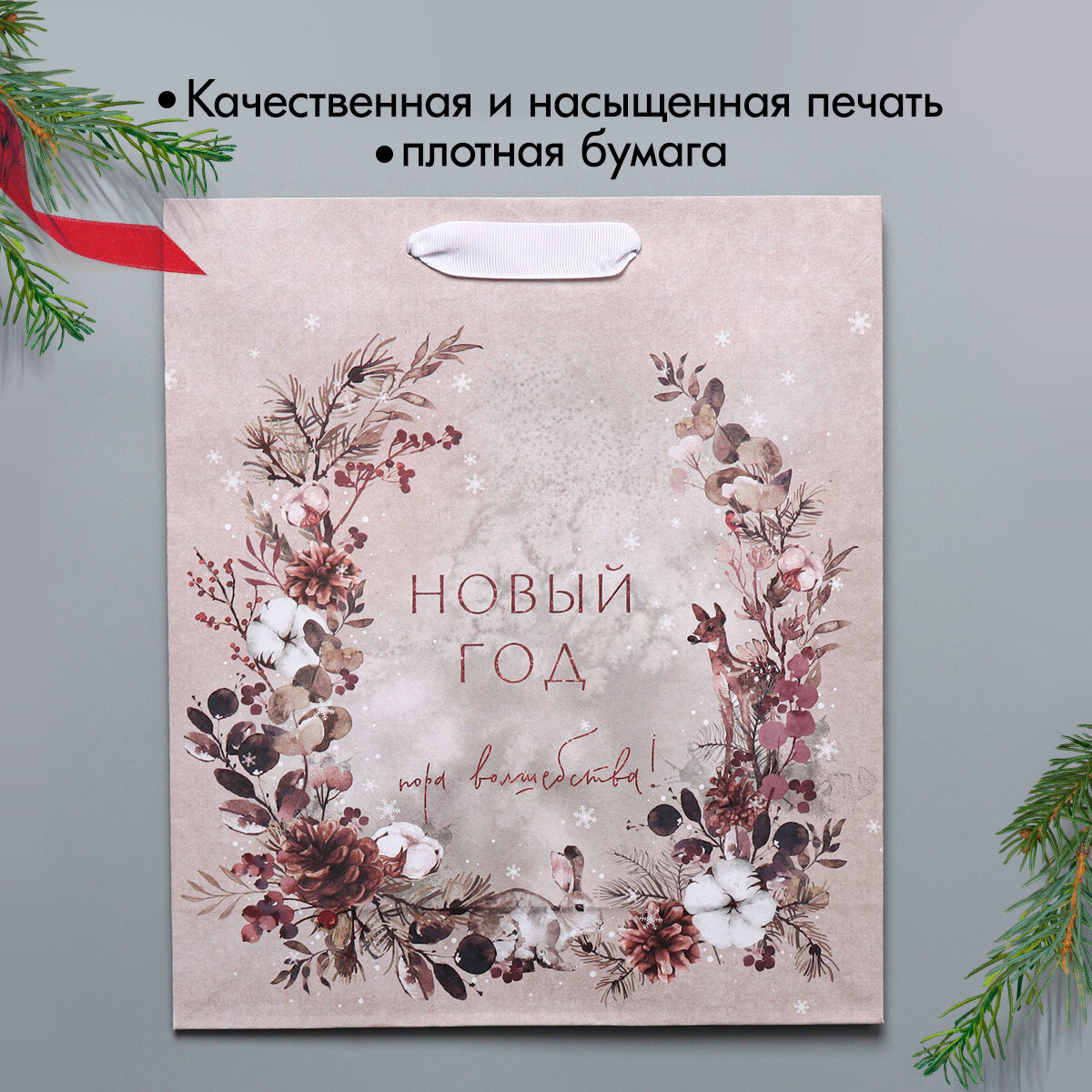 Пакет подарочный новогодний, «Мир волшебства», M 26 х 30 х 9 см, бежевый, для упаковки подарка на Новый год информация: