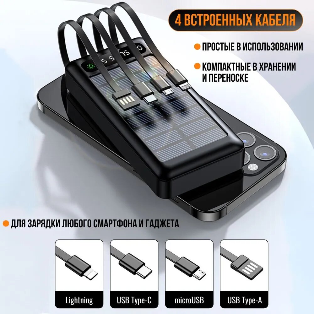 Универсальный Powerbank (Повер Банк) 50000 mAh со встроенными кабелями, солнечной батарей, беспроводная зарядка для iphone, внешний аккумулятор, черного цвета информация: