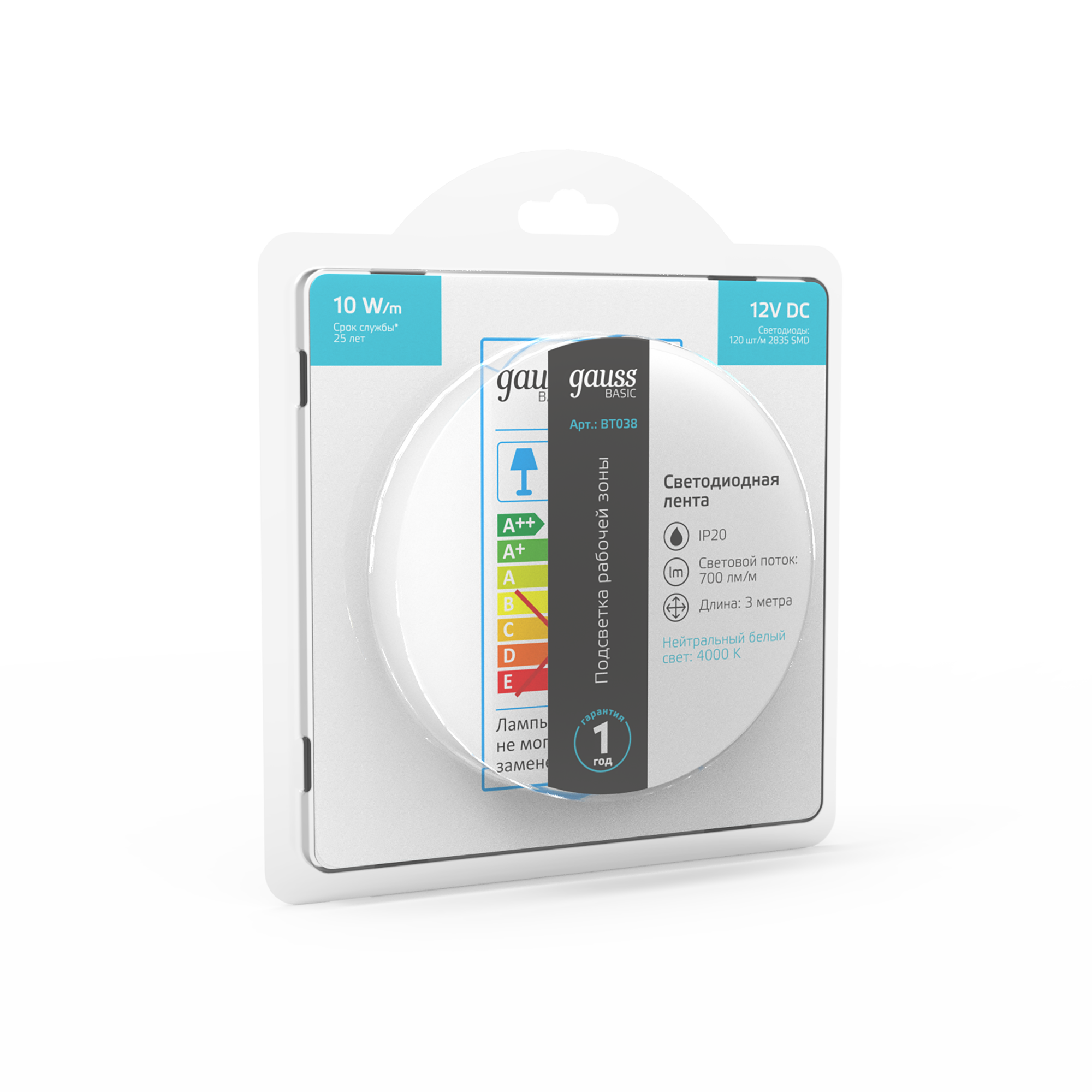 Лента Gauss Basic LED 2835/120 12V 10W/m 700lm/m 4000K 8mm IP20 3m 1/100 554 ₽