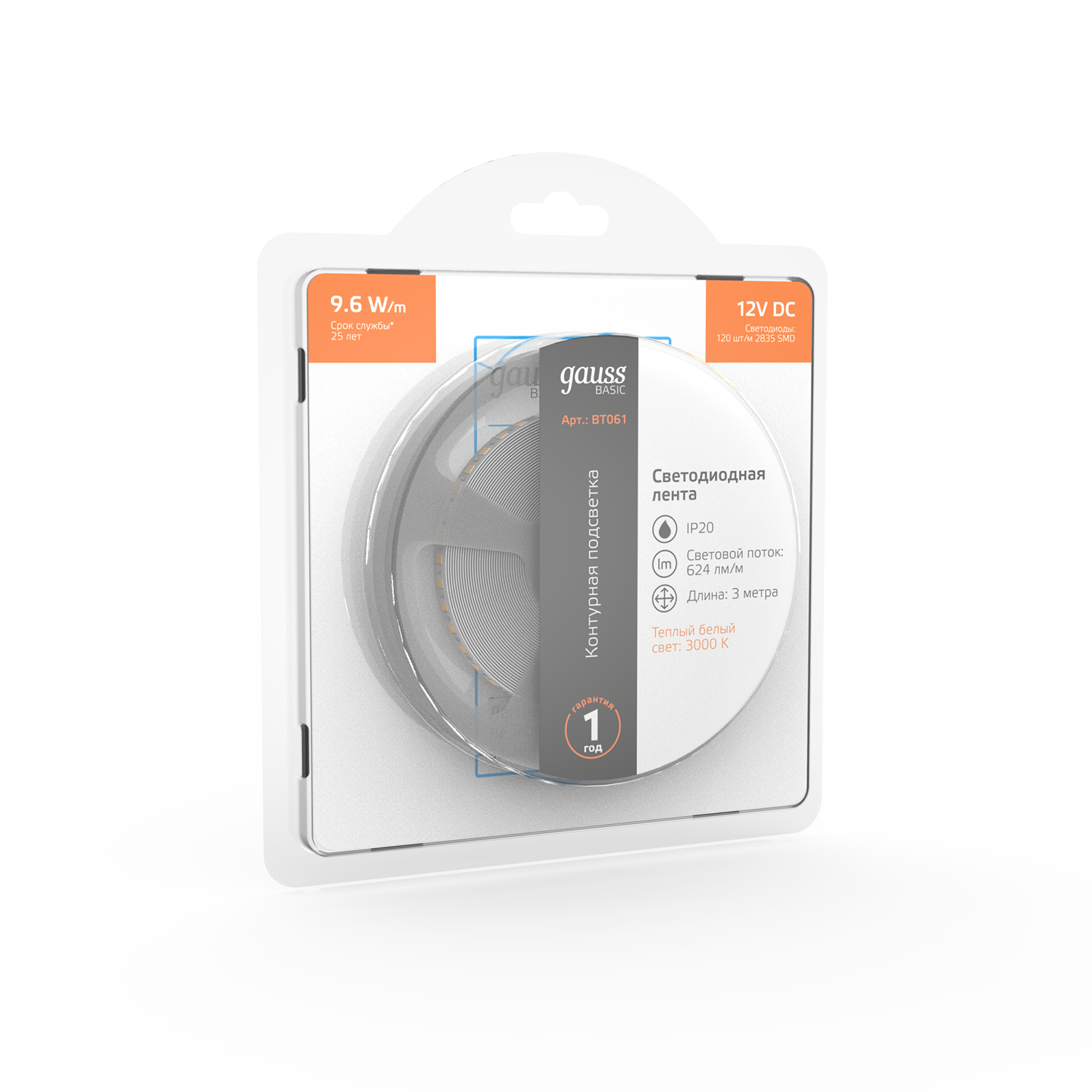 | Комплектация | Лента LED (3000К) Basic GAUSS тип 2835 DC 12В 9,6Вт 624лм/Вт 120led/м IP20 8 мм (бухта 3м) |